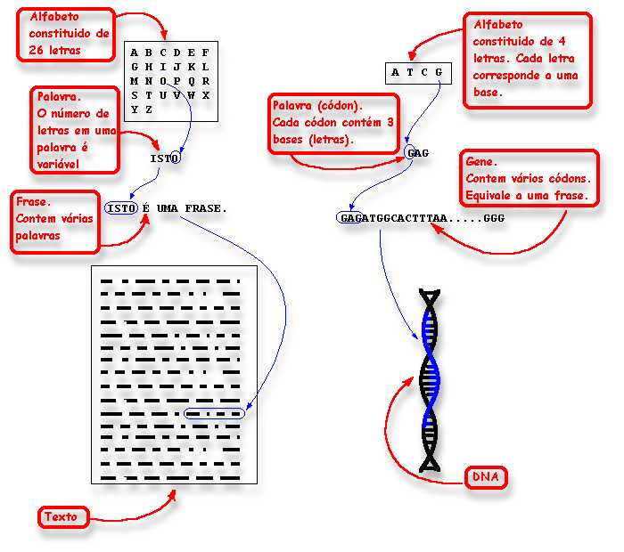 Na linguagem química do código genético, um gene funciona como uma "sentença", cujo alfabeto usa as letras A, C, G e T referentes às quatro bases. Cada conjunto de 3 bases (códon), na seqüência ao longo da "escada" do DNA, seriam as "palavras" (o DNA seria o "texto"), as quais sinalizam às células um determinado aminoácido a ser usado na síntese da proteína. Por exemplo, a seqüência de bases ATG codifica o aminoácido metionina. Um fragmento do DNA com a seqüência GAGATGGCA codifica uma seqüência de três aminoácidos, que são, respectivamente, ácido glutâmico, metionina e alanina.
