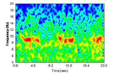 As regiões vermelhas correspondem às ondas Alfa (olhos fechados) com uma freqüência ao redor 9 Hz. (cortesia da